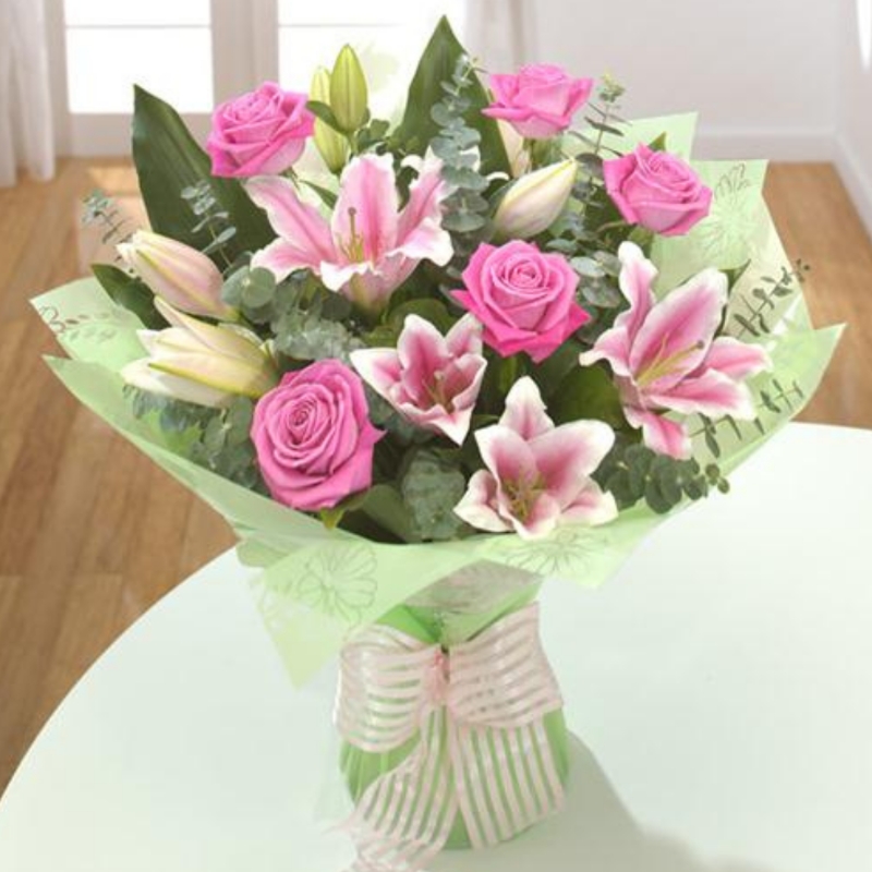 A beautiful bouquet of lily and roses available in a variety of colour schemes.  A favourite of our customers and our team.