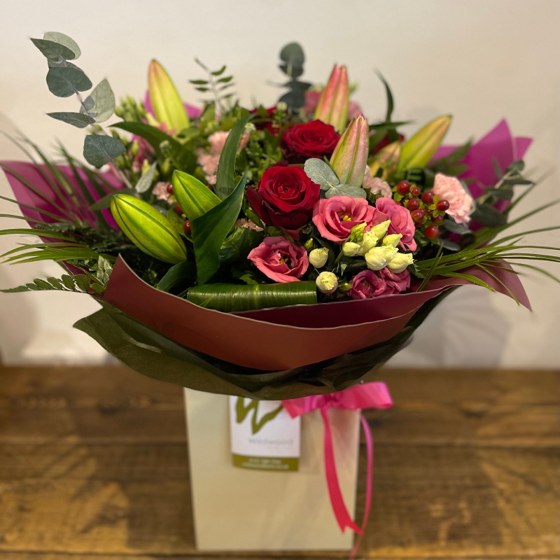 The Redwood is a bold and bright bouquet featuring a selection of seasonal stems in shades of red and deep pink.