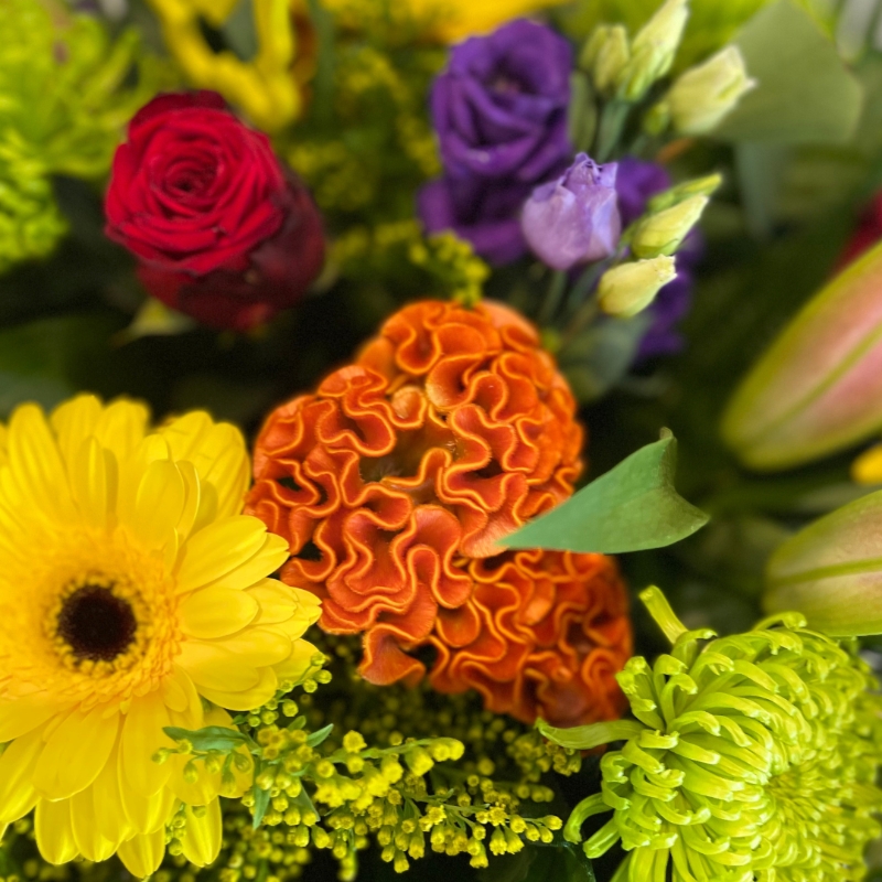 The Palm is a bright and funky selection of seasonal stems in a mixture of vivid shades.
