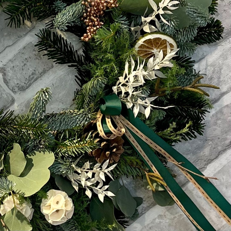 A beautiful door garland in shades of green and white, featuring seasonal foliages with festive hi-lights.