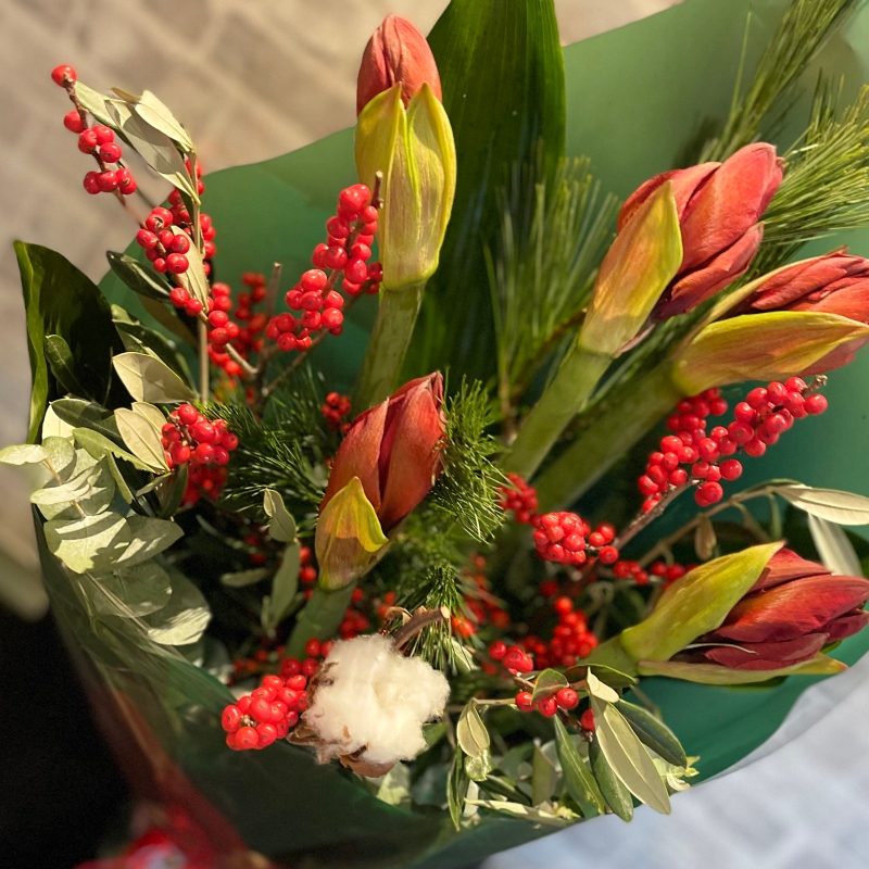 A stunning mix of fresh Christmas flowers and winter foliages, featuring premium amaryllis and seasonal ilex berries.
