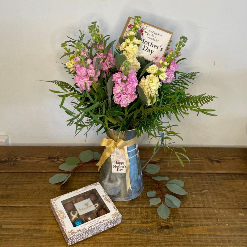 A selection of beautiful scented stocks displayed in a reusable zinc jug.