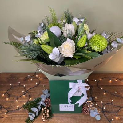 A beautiful wintery white bouquet with festive accents, the perfect Christmas gift.